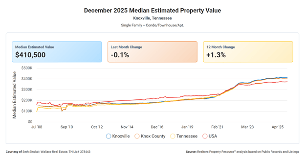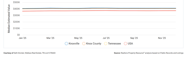 At the same time, pricing momentum has moderated. Median home values across the broader Knoxville area increased only 1.3 percent year over year, a sharp contrast to the roughly 54 percent cumulative increase from spring 2021 through the end of 2023. In some West Knoxville submarkets, appreciation during that earlier period exceeded 90 percent.