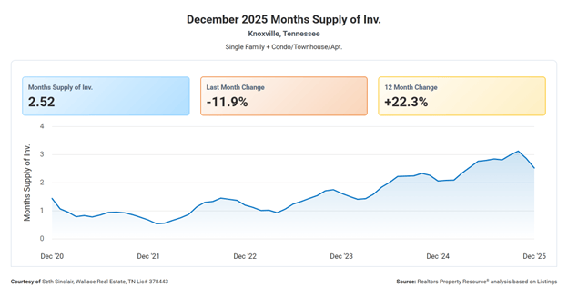 Inventory remains one of the most important indicators of market health. Across the greater Knoxville area, months of supply sits at approximately 2.5 months, well below the roughly 5 months typically associated with a balanced market. From a supply standpoint, this continues to favor sellers. We did see inventory tick upward to just over 3 Months Supply in October 2025, a trend that will hopefully resume after an expected end of year drop off.